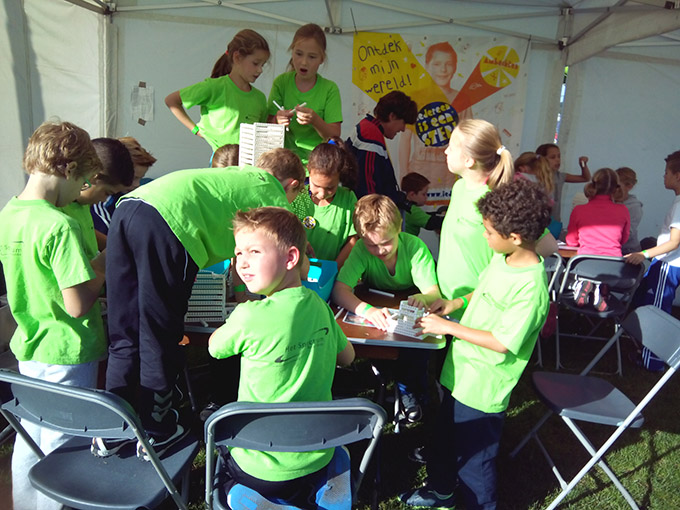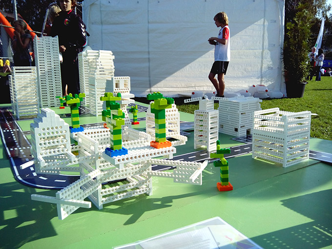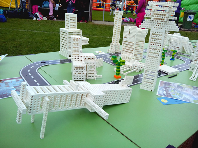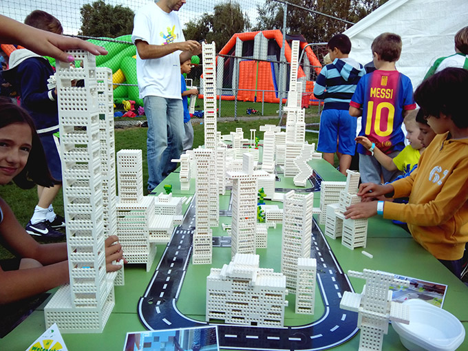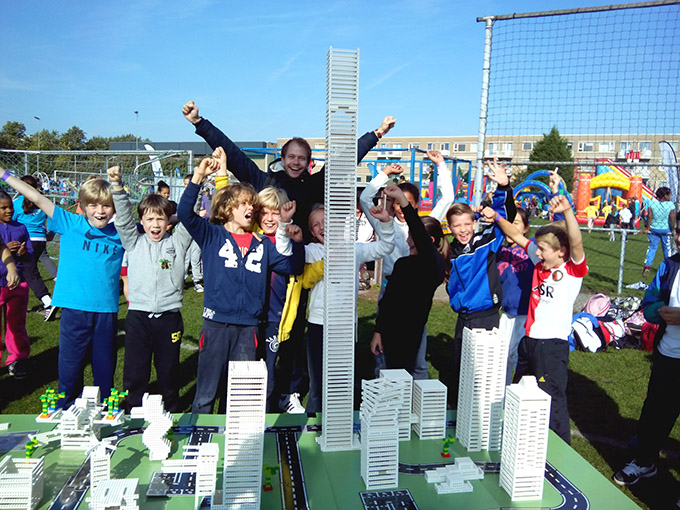 Children make a LEGO city with white LEGO blocks. From low-rise to high-rise buildings, schools, city halls, sport halls to hospitals. They are challenged to think about where cars need to be parked and where green is located.